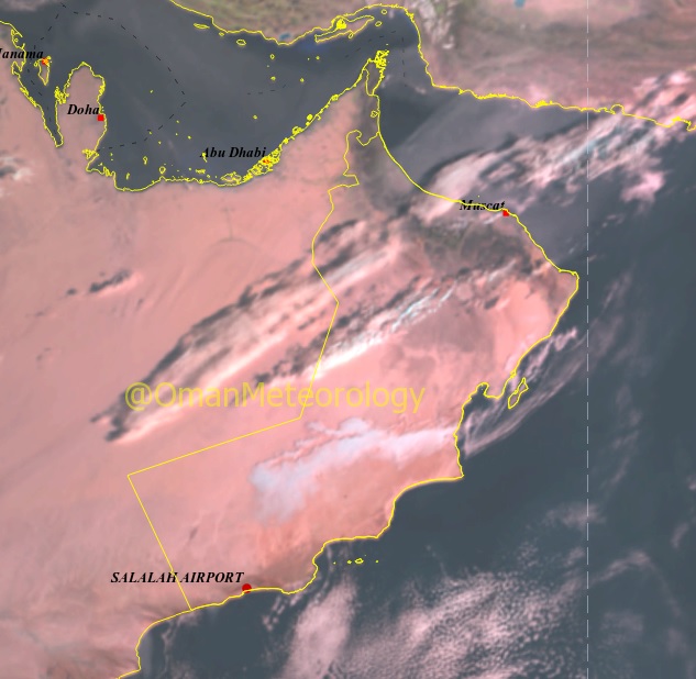 الصورة الجوية توضح تدفق السحب و الغبار والعوالق الترابية على معظم محافظات السلطنة كما تتواجد السحب المنخفضة على أجزاء من محافظات الظاهرة و جنوب الشرقية والوسطى