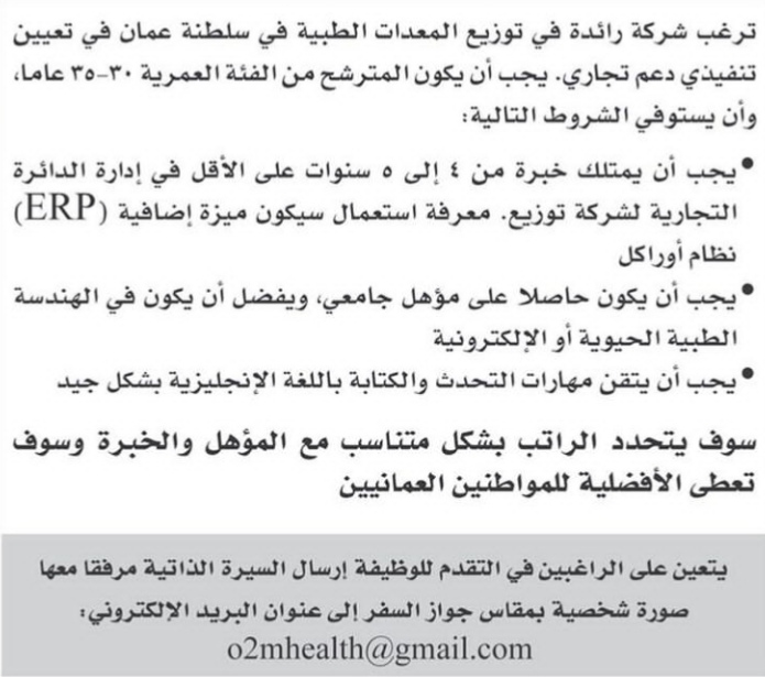 أعلنت شركة رائدة توزيع المعدات الطبية عن رغبتها بتعيين لديها تنفيذي دعم تجاري بالشروط التالية :