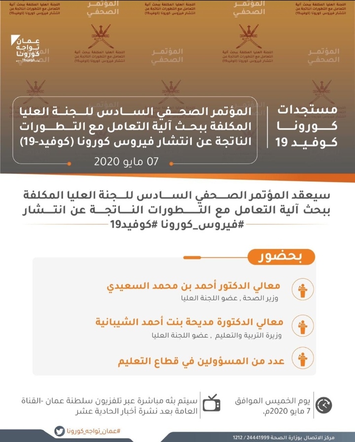 سيعقد المؤتمر الصحفي السادس للجنة العليا المكلفة ببحث آلية التعامل مع التطورات الناتجة عن انتشار #فيروس_كورونا #كوفيد19 بحضور معالي د.أحمد السعيدي وزير الصحة ومعالي د. مديحة الشيبانية وزيرة التربية والتعليم وعدد من المسؤولين في قطاع التعليم يوم الخميس الموافق ٧ مايو ٢٠٢٠م .
