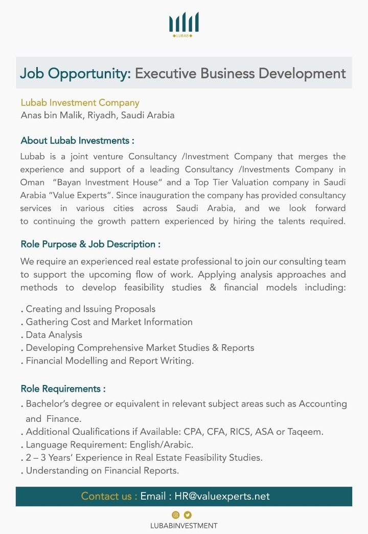 أعلنت شركة لباب للإستثمار و هي شركة عمانية سعودية عن توفر شاغر وظيفي لديها للعمانيين بمسمى : تطوير الأعمال التنفيذية