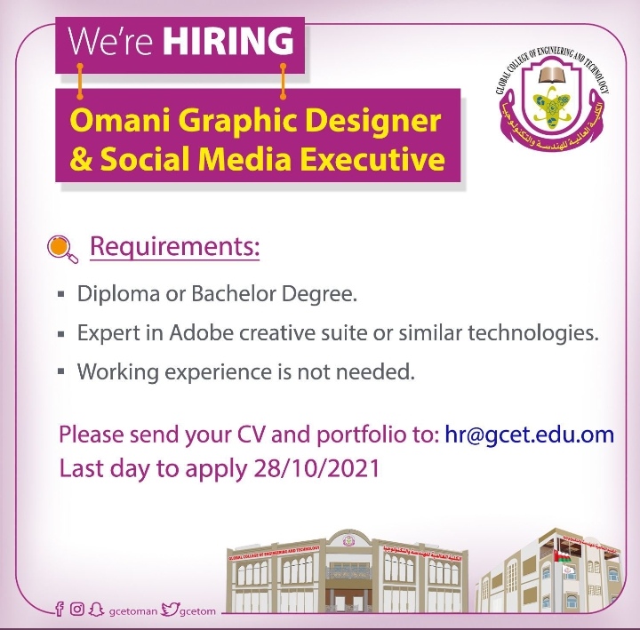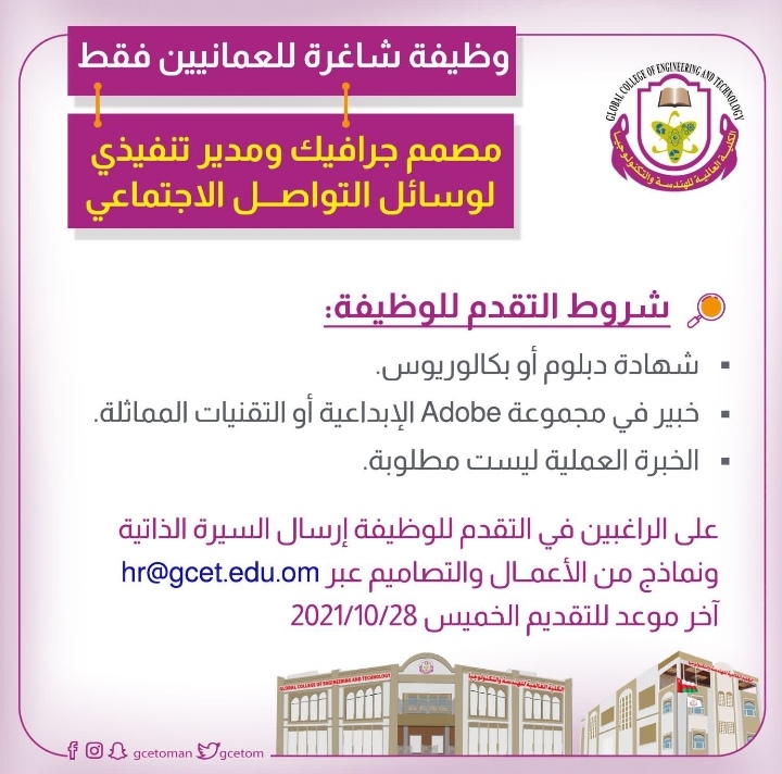 أعلنت الكلية العالمية للهندسة والتكنولوجيا عن رغبتها بتعيين لديها مصمم جرافيك ومدير تنفيذي لوسائل التواصل الإجتماعي.
