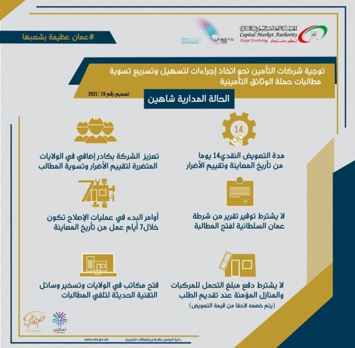 و كما وجهت الهيئة جميع شركات التأمين إلى ضرورة فتح عدة قنوات من خلال مكاتبها وفروعها وتسخير وسائل التقنية الحديثة والاتصال لتلقي المطالبات والبت فيها بما يضمن سهولة تعويض المتضررين في كافة الشركات المعنية لتوفير كافة التسهيلات والمرونة المطلوبة ومن أهمها عدم اشتراط حصول حملة الوثائق على التقارير الصادرة من شرطة عمان السلطانية لفتح المطالبات، بالإضافة إلى عدم اشتراط دفع مبلغ التحمل للمركبات والمنازل المؤمنة بحيث يتم خصمه لاحقا من قيمة التعويض في حالة التعويض النقدي.