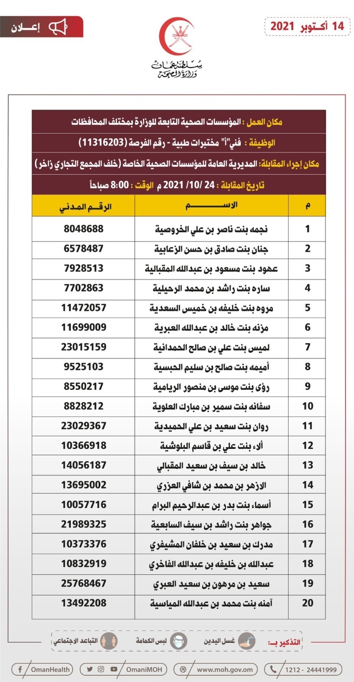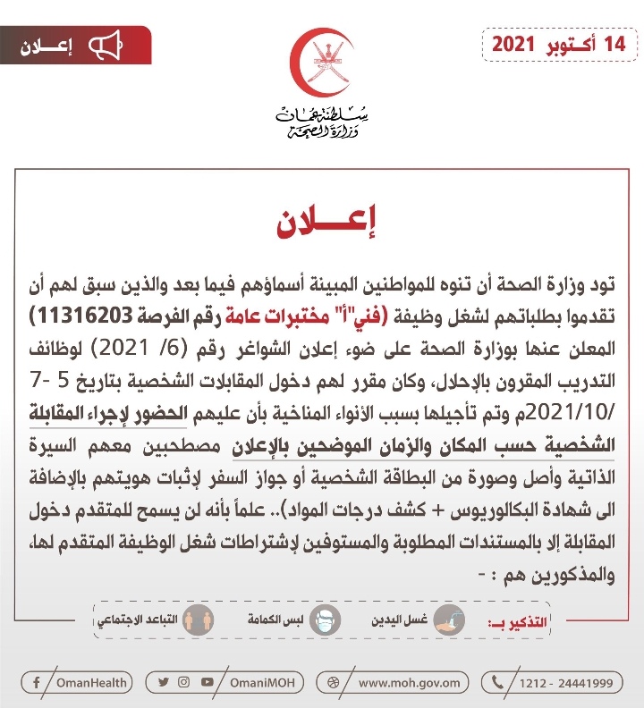 نبهت وزارة الصحة المواطنين المبينة أسماؤهم أدناه والذين سبق لهم أن تقدموا بطلباتهم لشغل وظيفة (فني”أ” مختبرات عامة) بأن عليهم الحضور لإجراء المقابلة الشخصية حسب المكان والزمان الموضحين بالإعلان.