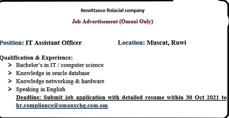 أعلنت شركة عمان للصرافة عن رغبتها بتعيين لديها مساعد مسئول تكنولوجيا المعلومات