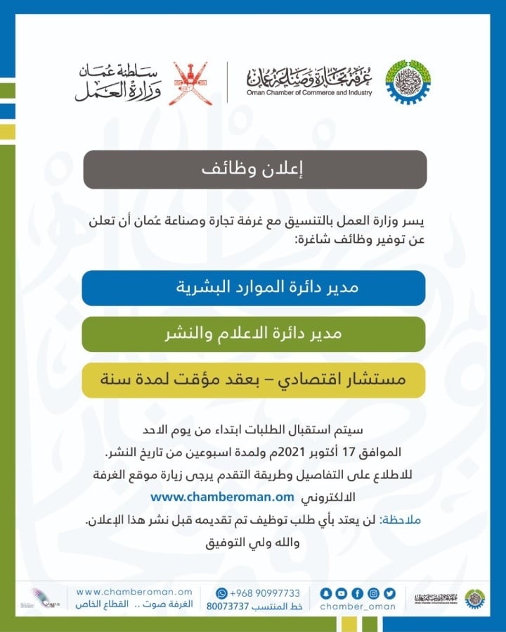 أعلنت غرفة وتجارة وصناعة عمان عن شواغر وظيفية لديها :