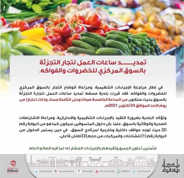 أعلنت بلدية مسقط عن تمديد ساعات العمل لِتجار التجزئة بالسوق المركزي للخضروات والفواكه.