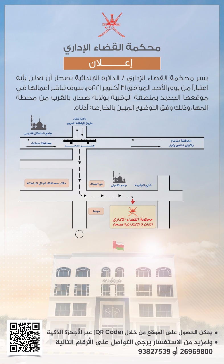 أعلنت محكمة القضاء الإداري/ الدائرة الابتدائية بصحار بأنه اعتبارًا من يوم الأحد الموافق ٣١ أكتوبر ٢٠٢١م سوف تباشر أعمالها في موقعها الجديد بمنطقة الوقيبة بولاية صحار بالقرب من محطة المها و ذلك وفق التوضيح المبين بالخارطة أدناه.