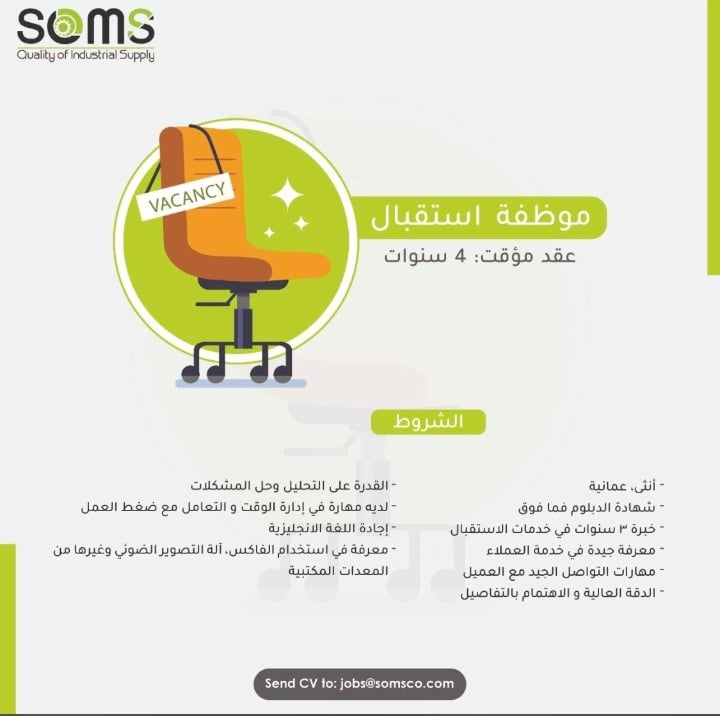 أعلنت شركة تفوق الخدمات الحديثة عن رغبتها بتعيين لديها موظفة استقبال.