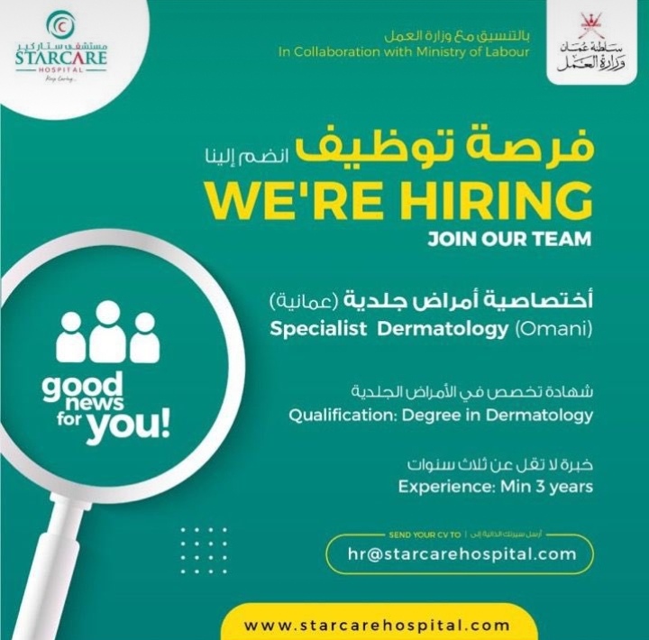 أعلن مستشفى ستاركير عن رغبته بتعيين لديه أختصاصية أمراض جلدية.