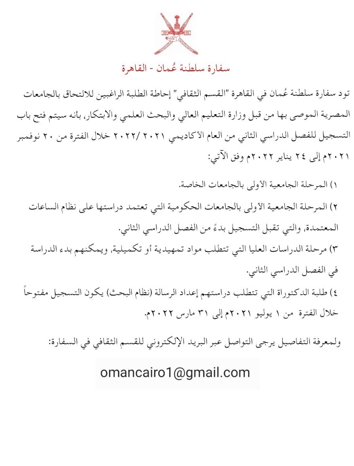 إعلان من سفارة السلطنة في القاهرة للطلبة الراغبين للالتحاق بالجامعات المصرية الموصى بها من قِبل وزارة التعليم العالي والبحث العلمي والابتكار ، بأنه سيتم فتح باب التسجيل للفصل الدراسي الثاني من العام الأكاديمي ٢٠٢١ /٢٠٢٢ خلال الفترة من ٢٠ نوفمبر ٢٠٢١م إلى ٢٤ يناير ٢٠٢٢م.