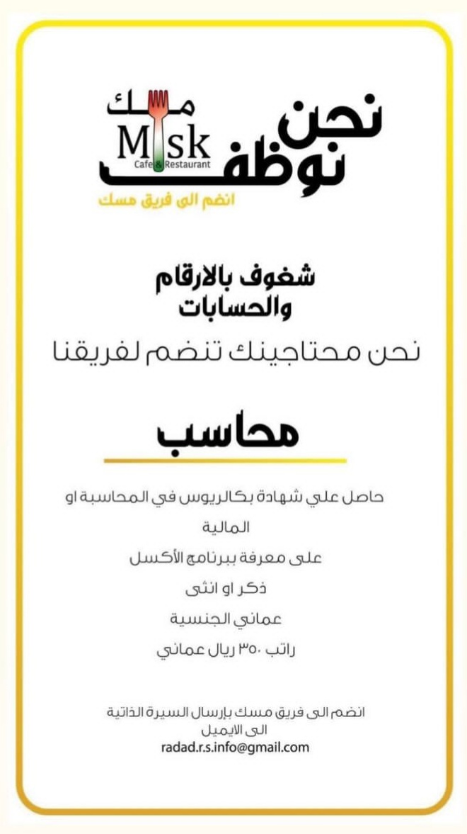 أعلن مطعم وكافيه مسك بالمعبيلة عن رغبته بتعيين لديه محاسب بالشروط التالية :
