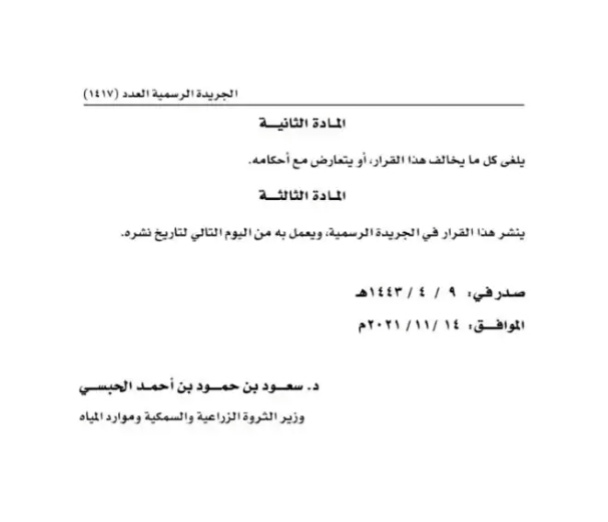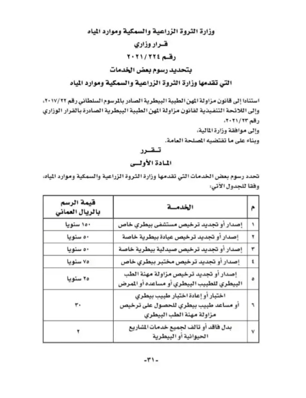 أصدر معالي الدكتور/ سعود بن حمود بن أحمد الحبسي - وزير الثروة الزراعية والسمكية وموارد المياه قرار وزاريا رقم 224/2021 بتحديد رسوم بعض الخدمات التي تقدمها الوزارة على النحو التالي:
