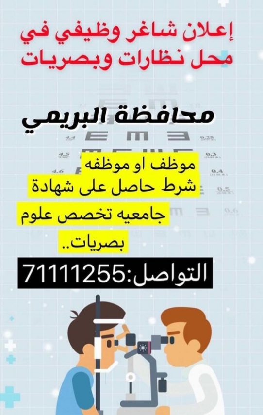مطلوب موظف أو موظفة للعمل في محل نظارات و بصريات.