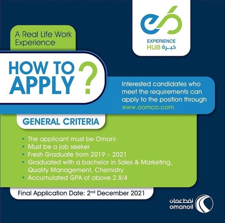 أعلنت شركة نفط عُمان للتسويق عن توفر فرص تدريب لخريجي البكالوريوس في المبيعات و التسويق و إدارة الجودة و الكيمياء.