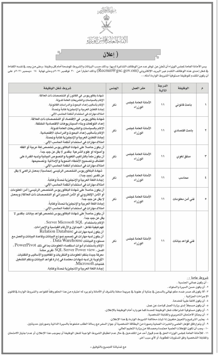 أعلنت الأمانة العامة لمجلس الوزراء عن رغبتها بتعيين لديها :