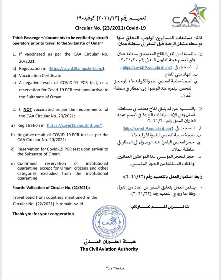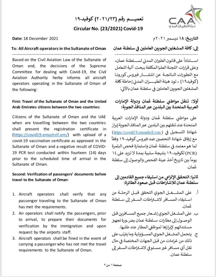 أصدرت هيئة الطيران المدني تعميما جديدا حول تنقل مواطني سلطنة عمان ودولة الإمارات العربية المتحدة بين البلدين عبر المنافذ الجوية، والتحقق الإلزامي من استيفاء جميع القادمين إلى سلطنة عمان للاشتراطات قبل الصعود إلى الطائرة.