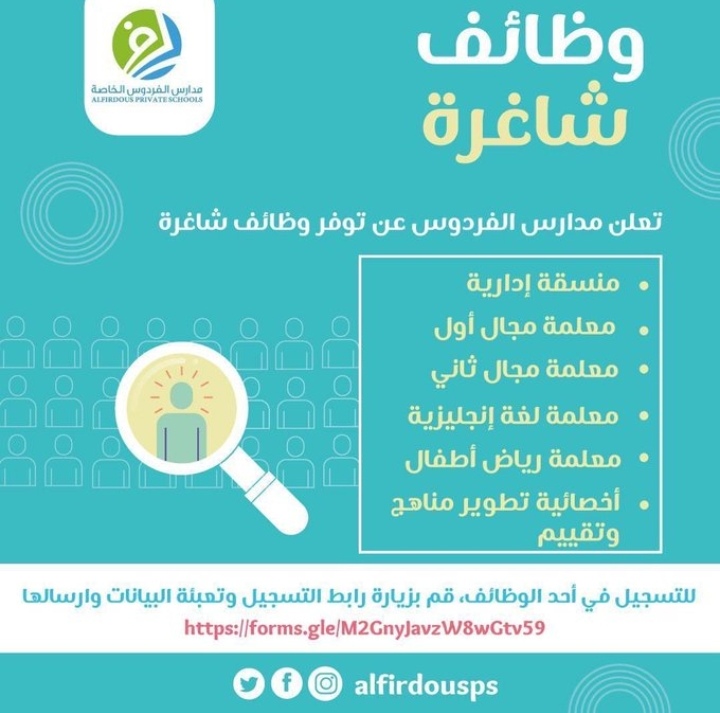 أعلنت مدارس الفردوس الخاصة عن رغبتها بتعيين لديها :