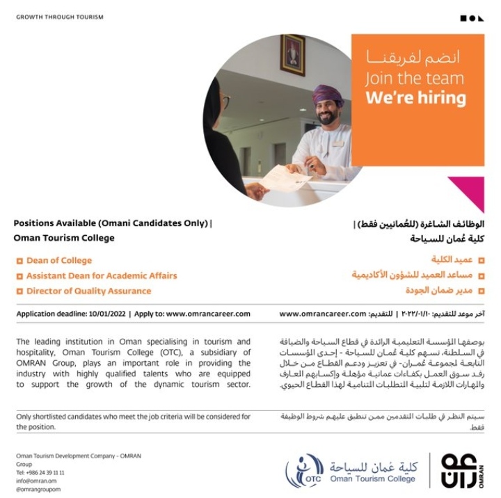أعلنت كلية عمان للسياحة التابعة لمجموعة عمران عن توفر فرص وظيفية لديها للعمانيين فقط.