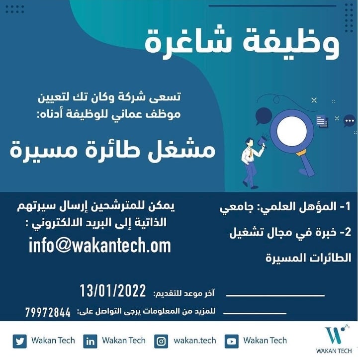 أعلنت شركة وكان تك عن رغبتها بتعيين لديها مشغل طائرة مسيرة .
