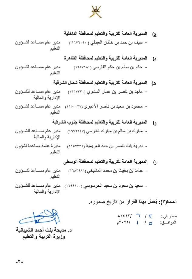 أصدرت معالي الدكتورة مديحة بنت أحمد الشيبانية، وزيرة التربية والتعليم القرار الوزاري رقم 2 لسنة 2022 بشأن إجراء نقل وتعيين.