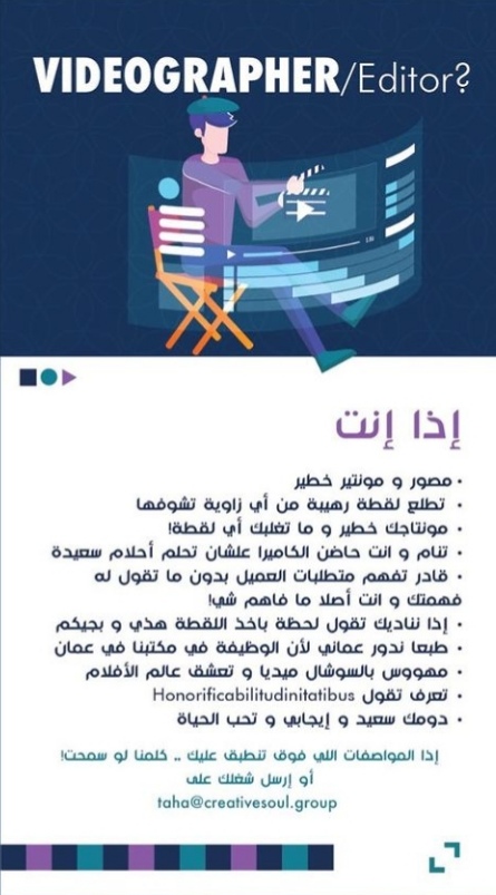 أعلنت شركة إنتاج الروح الإبداعية عن رغبتها بتعيين لديها مصور فيديو / محرر.