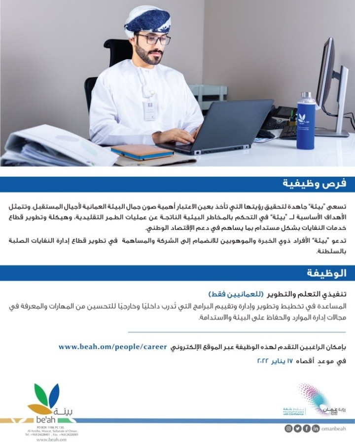 أعلنت الشركة العمانية لخدمات البيئة ” بيئة” عن رغبتها بتعيين لديها تنفيذي التعلم والتطوير .