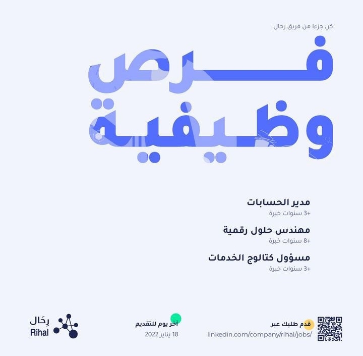 أعلنت شركة رحال عن رغبتها بتعيين لديها : ١. مدير الحسابات.٢. مهندس حلول رقمية.٣. مسئول كتالوج الخدمات. للتقديم اضغط هنا لتصفح المزيد من جديد الوظائف و التدريب بالسلطنة اضغط هنا