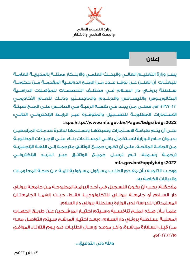 أعلنت وزارة التعليم العالي والبحث العلمي والابتكار عن توفر عدد من المنح الدراسية المقدمة من حكومة سلطنة بروناي دار السلام في مختلف التخصصات للمؤهلات الدراسية البكالوريوس والليسانس والدبلوم والماجستير وذلك للعام الأكاديمي2022/2023م.