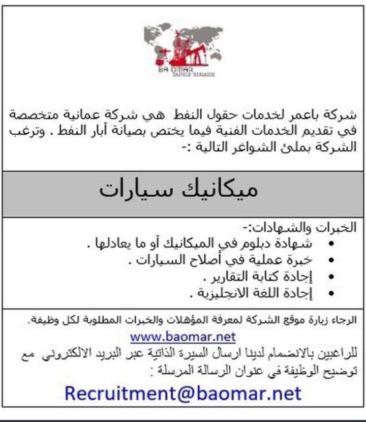 أعلنت شركة باعمر لخدمات حقول النفط عن رغبتها بتعيين لديها ميكانيك سيارات.