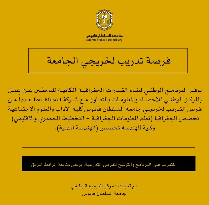 أعلنت جامعة السلطان قابوس عن فرص تدريبية لخريجي الجامعة من التخصصات التالية: