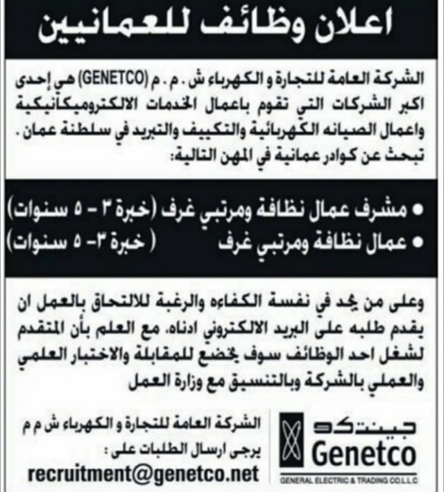 ١٠. مشرف عمال نظافة و مرتبي غرف أعلنت الشركة العامة للتجارة و الكهرباء عن توفر شواغر وظيفية لديها بمسمى :
