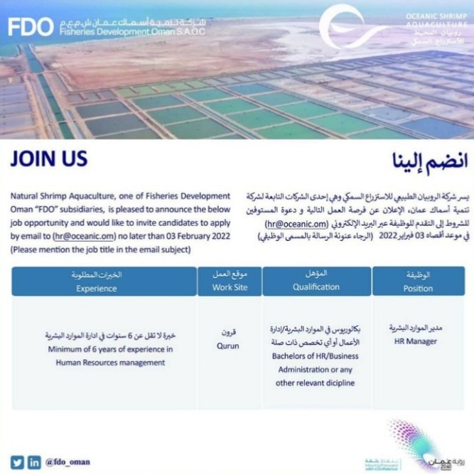 أعلنت شركة الروبيان للاستزراع السمكي عن رغبتها بتعيين لديها مدير الموارد البشرية.