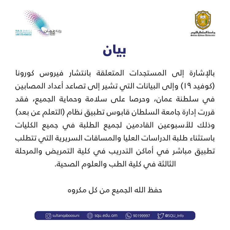 قررت إدارة جامعة السلطان قابوس تطبيق نظام ( التعلم عن بعد وذلك للأسبوعين القادمين لجميع الطلبة في جميع الكليات باستثناء طلبة الدراسات العليا والمساقات السريرية التي تتطلب تطبيق مباشر في أماكن التدريب في كلية التمريض والمرحلة الثالثة في كلية الطب والعلوم الصحية .