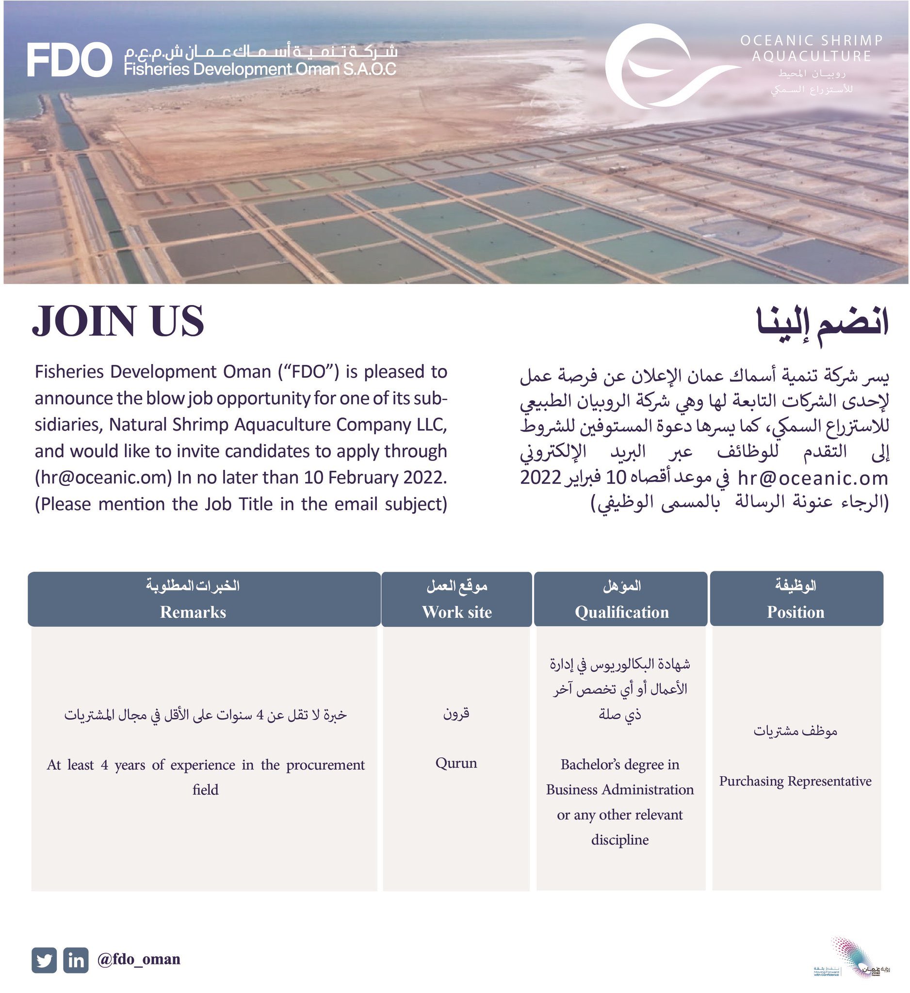 تعلن شركة تنمية أسماك عمان عن توفر فرص عمل حسب التفاصيل الموضحة في الإعلان المرفق