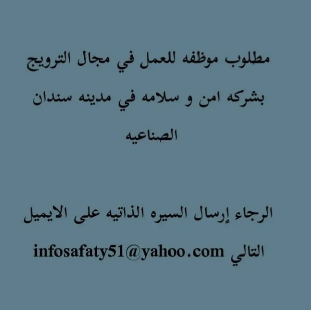 مطلوب موظفة للعمل في مجال الترويج بشركة أمن و سلامة في مدينة سندان الصناعية.