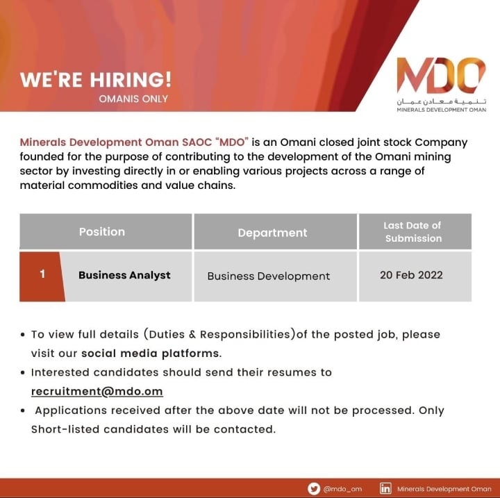 أعلنت شركة تنمية معادن عمان عن رغبتها بتعيين لديها :