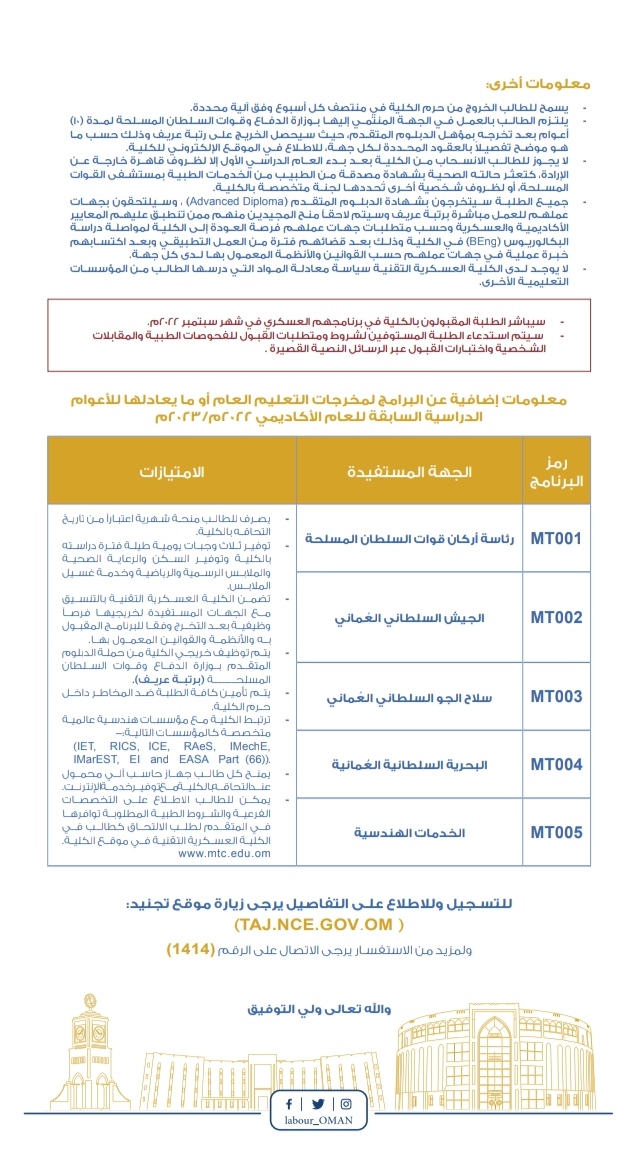 أعلنت وزارة العمل بالتنسيق مع الكلية العسكرية التقنية بوزارة الدفاع عن توفر مقاعد دراسية محدودة لمخرجات دبلوم التعليم العام أو ما يعادله .