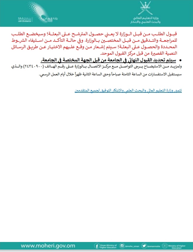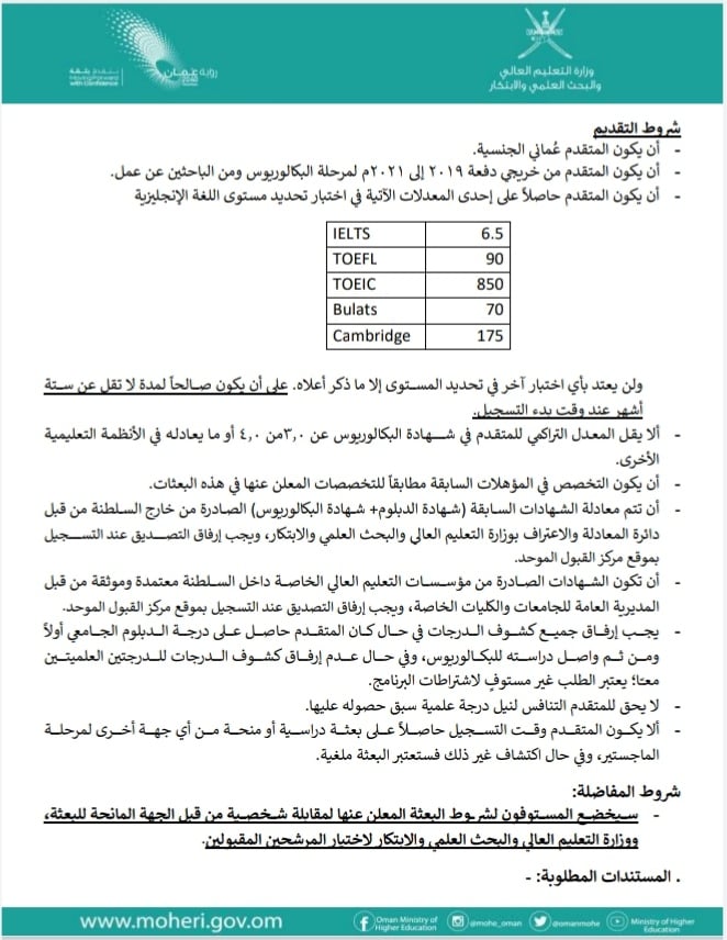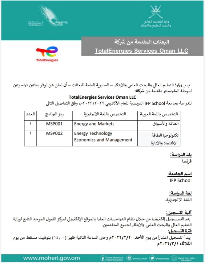 أعلنت وزارة التعليم العالي والبحث العلمي والابتكار عن توفر بعثتين دراسيتين لمرحلة الماجستير مقدمة من شركة Total Energies Services Oman LLC للدراسة بجامعة IFP School الفرنسية للعام الأكاديمي ٢.٢٢ / ٢٠٢٣م