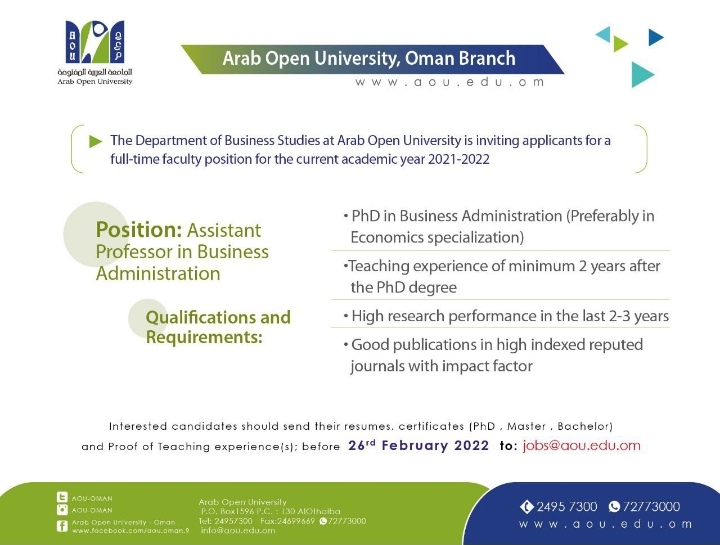 أعلنت الجامعة العربية المفتوحة عن رغبتها بتعيين لديها أستاذ مساعد في إدارة الأعمال: