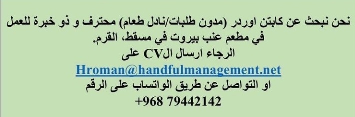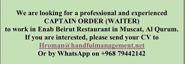 أعلن مطعم عنب بيروت في مسقط عن رغبته بتعيين لديه نادل طعام.