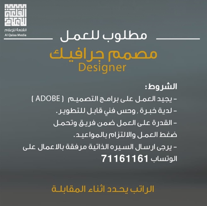 أعلنت مؤسسة القلعة للإعلام عن رغبتها بتعيين لديها مصمم جرافيك.