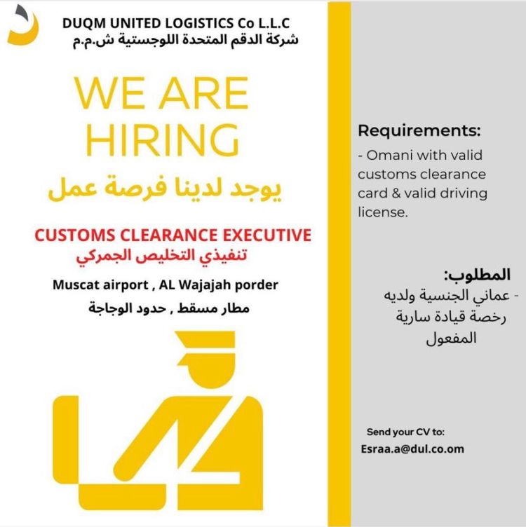 أعلنت شركة الدقم المتحدة اللوجستية عن رغبتها بتعيين لديها تنفيذي التخليص الجمركي.