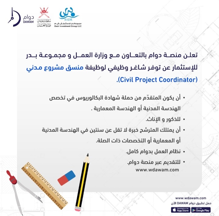 أعلنت مجموعة بدر للاستثمار عن رغبتها بتعيين لديها منسق مشروع مدني.