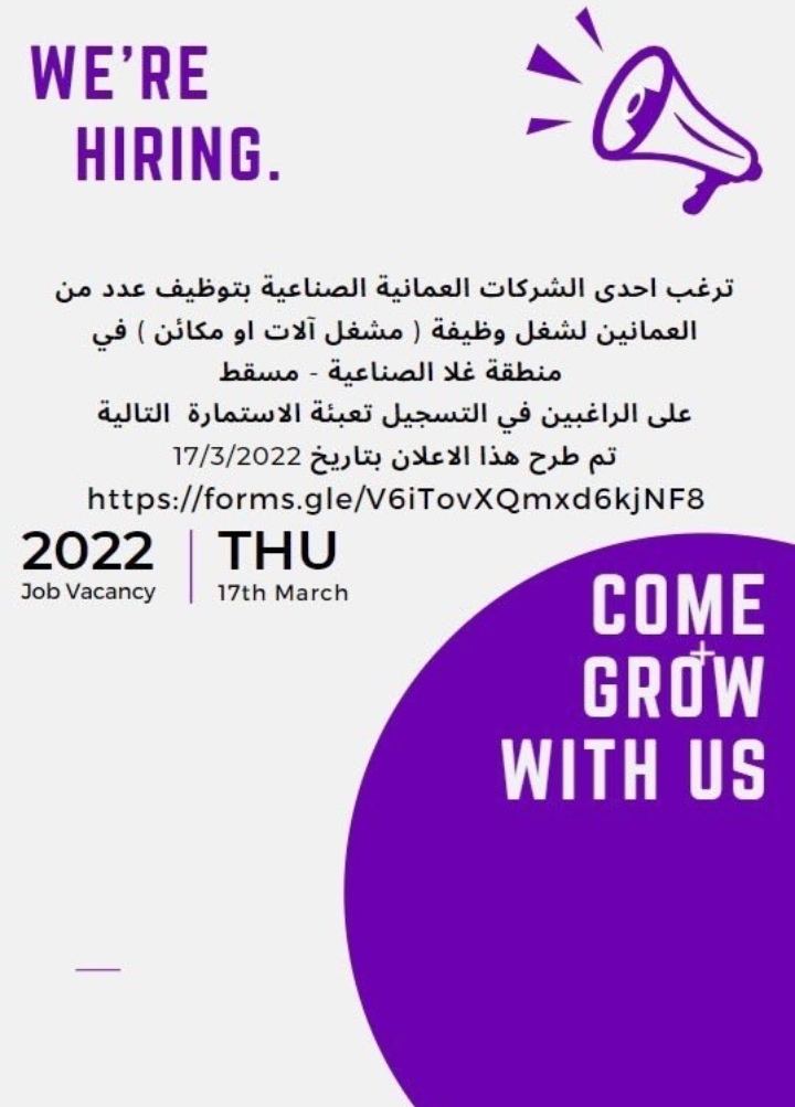 أعلنت شركة صناعية بتوظيف عدد من العمانين لشغل وظيفة ( مشغل آلات او مكائن ) في منطقة غلا الصناعية – مسقط.