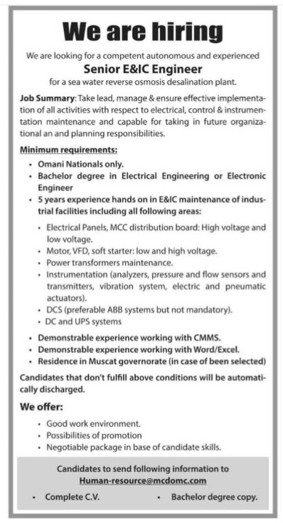 أعلنت شركة في مجال تحلية مياه البحر عن رغبتها بتعيين لديها مهندس أول E و IC