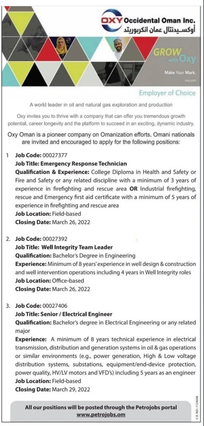 أعلنت شركة أوكسيدينتال عمان عن رغبتها بتعيين لديها :
