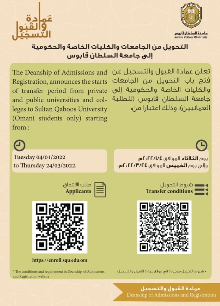 الحاقاً بالإعلان السابق تم تمديد فترة التحويل من الجامعات والكليات الخاصة والحكومية إلى جامعة السلطان قابوس(للطلبة العمانيين)، إلى يوم الأحد الموافق 26/06/2022 إلى 8:00 صباحاً.