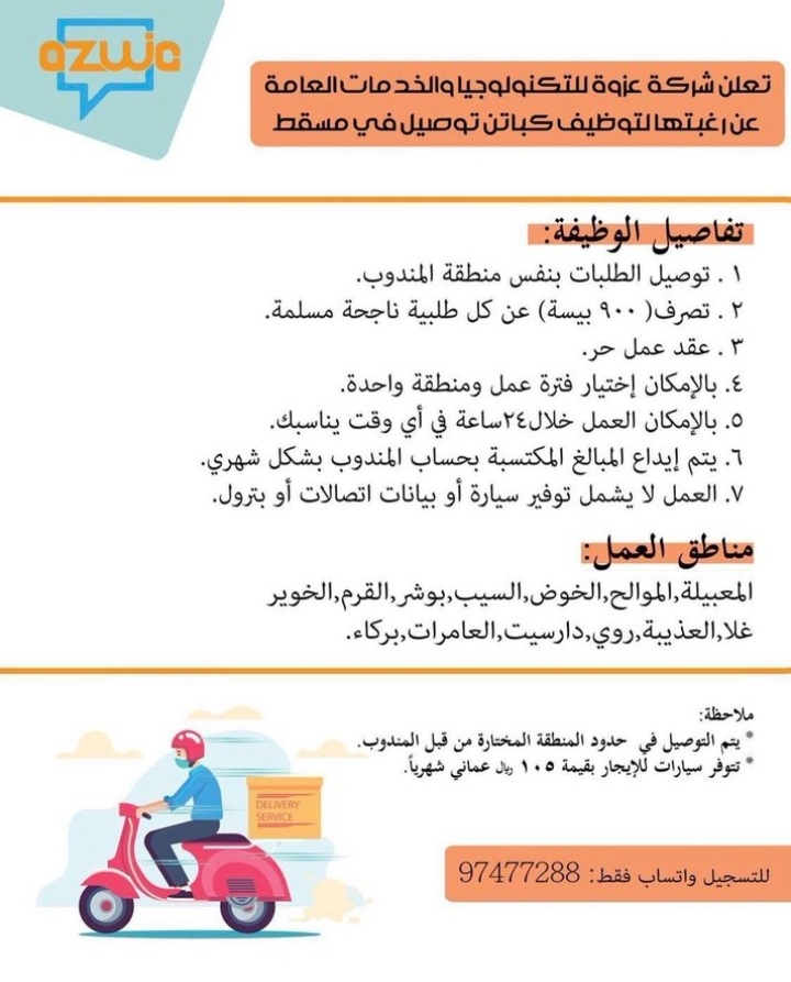 أعلنت شركة عزوة للتكنولوجيا والخدمات العامة عن رغبتها بتعيين لديها كباتن توصيل في محافظة مسقط.
