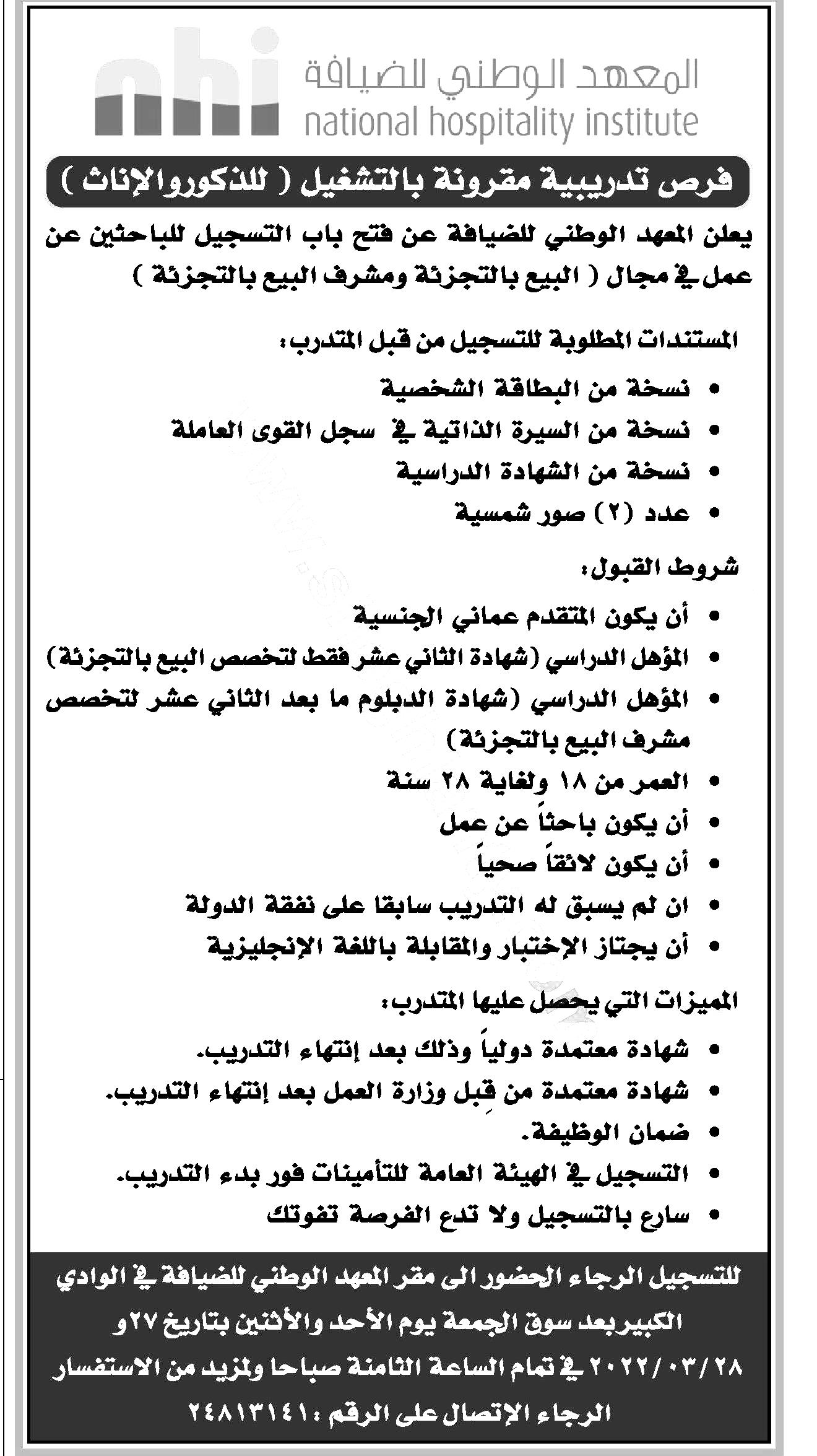 أعلن المعهد الوطني للضيافة عن فتح باب التسجيل للباحثين عن عمل في مجال البيع بالتجزئة ومشرف البيع بالتجزئة