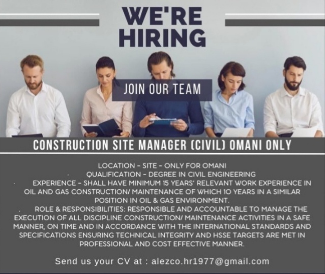أعلنت شركة العز للتجارة والنقل والمقاولات مدير موقع بناء.